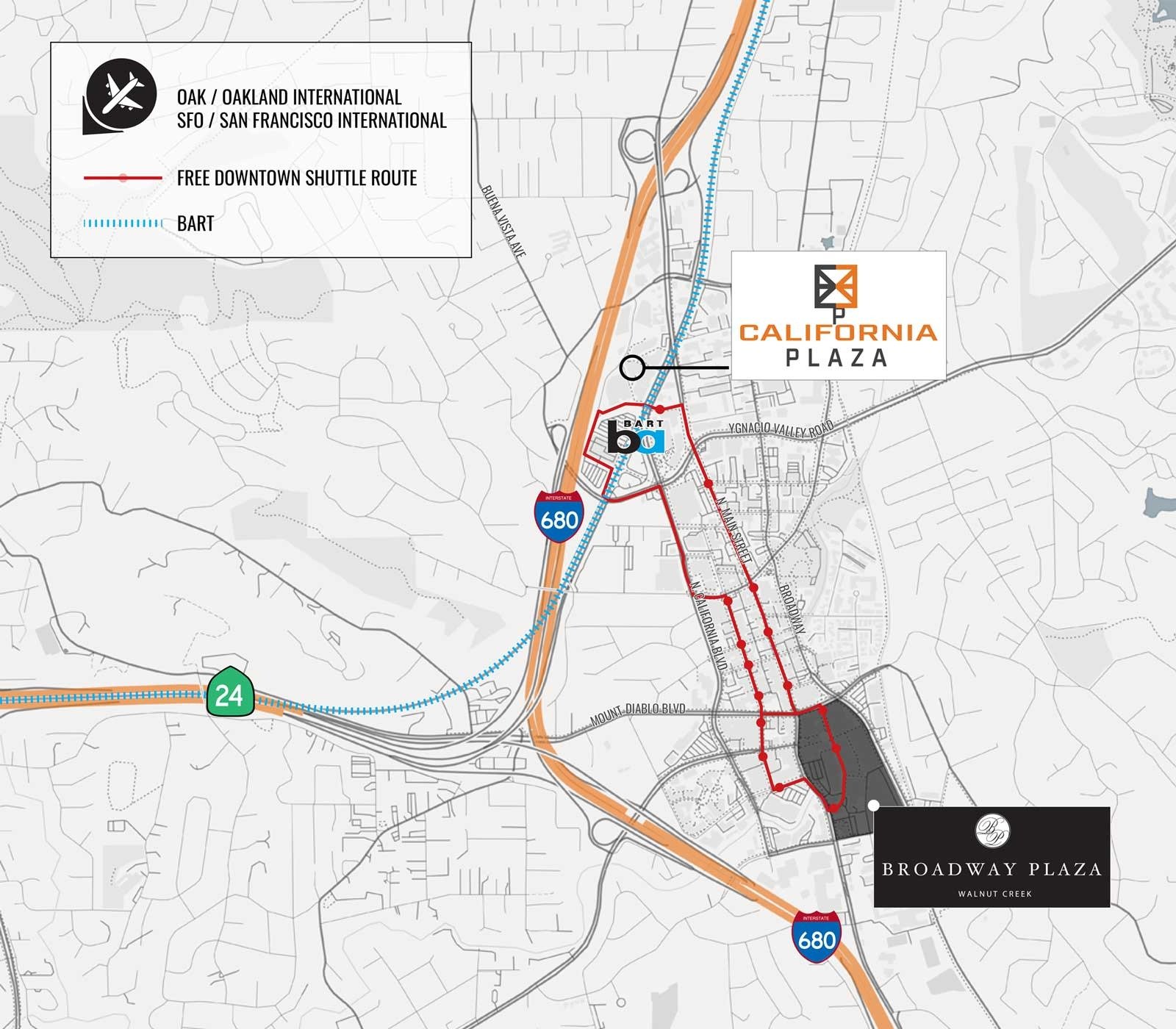 California Plaza offers exceptional connectivity, with immediate access to the Walnut Creek BART station, the Downtown Walnut Creek shuttle, and CA-24/I-680, providing an optimal hub for efficient travel.